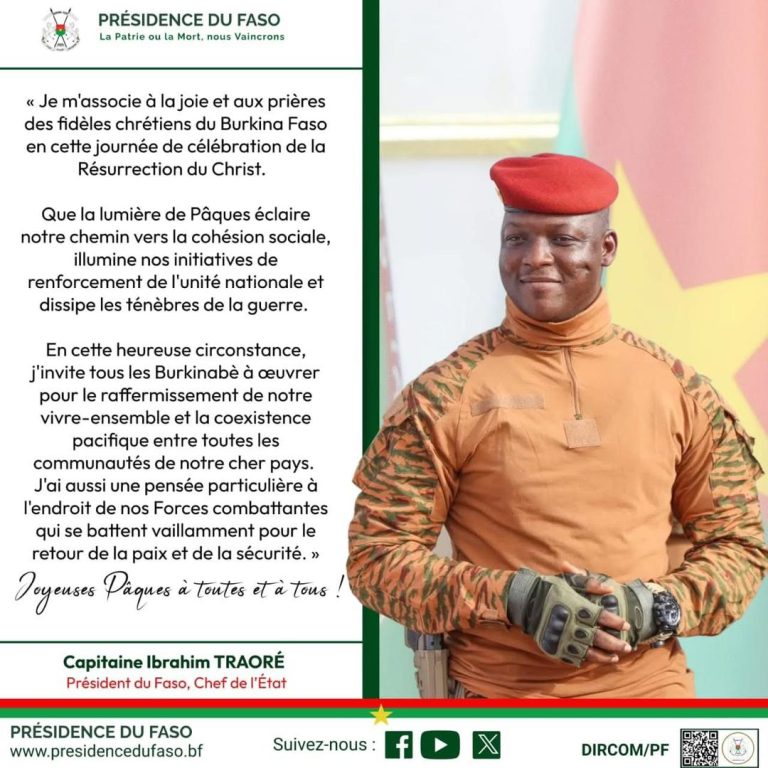 Actualités PÂQUES 2026 : message de Son Excellence le Capitaine Ibrahim TRAORÉ, Président du Faso, Chef de l’État à la communauté chrétienne 5 avril 2026
