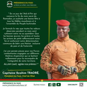 Actualités RAMADAN 2026 : LE MESSAGE DE SON EXCELLENCE LE CAPITAINE IBRAHIM TRAORÉ, PRÉSIDENT DU FASO, CHEF DE L’ÉTAT 20 mars 2026 Aucun commentaire