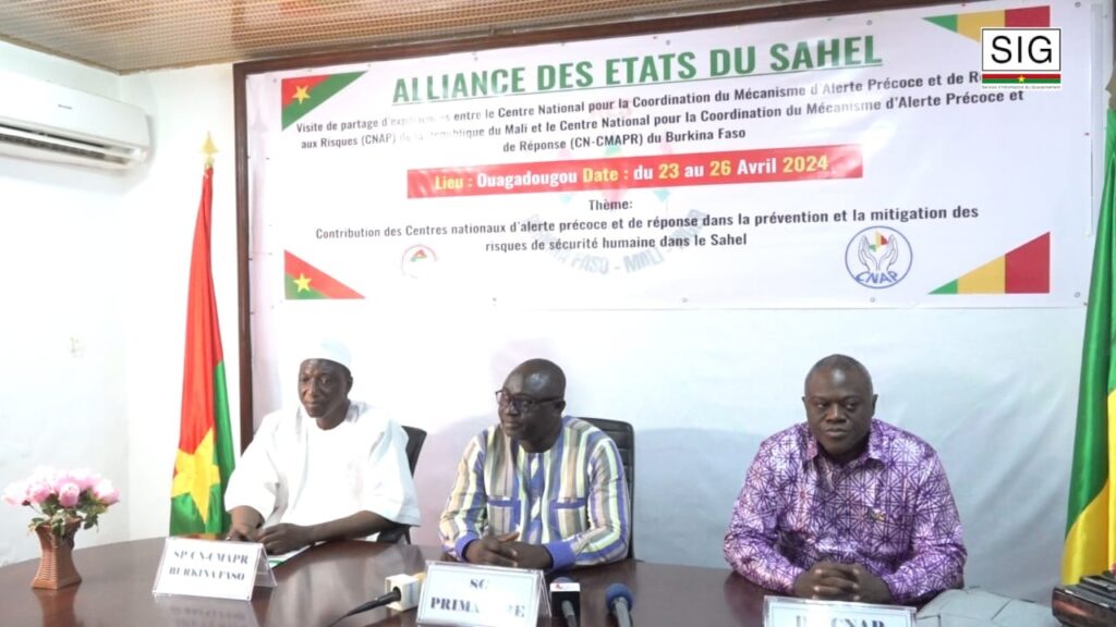 Le Secrétaire général de la Primature Abdoul Salam GAMPENE, a procédé le mardi 23 avril 2024 à Ouagadougou à l’ouverture des travaux des 72H de visite et de partage d’expériences entre les centres nationaux d’alerte précoce et de réponse du Mali et du Burkina Faso. La rencontre est placée sous le thème : « Contribution des centres nationaux d’alerte et de réponse dans la prévention et la mitigation des risques de sécurité humaine dans le Sahel ». Les centres nationaux d’alerte précoce et de réponse du Mali et du Burkina Faso envisagent une collaboration renforcée afin d’anticiper les menaces sur la sécurité humaine dans l’espace #AES.