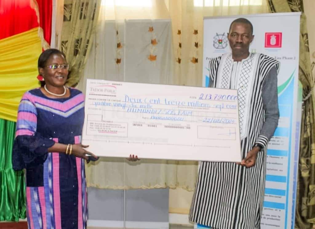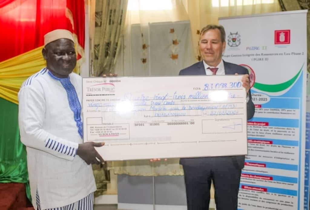 Le Ministre de l’Environnement, de l’Eau et de l’Assainissement, Roger BARO a présidé ce jeudi 22 février 2024, la cérémonie de remise de chèques aux porteurs de projets d’adaptation au changement climatique dans le cadre de la mise en œuvre du Projet Gestion intégrée et ressources en eau (Projet-#GIRE). C’était en présence de son cabinet et de l’Ambassadeur du Royaume de Danemark au Burkina Faso Kristian Kirkegaard Edinger.