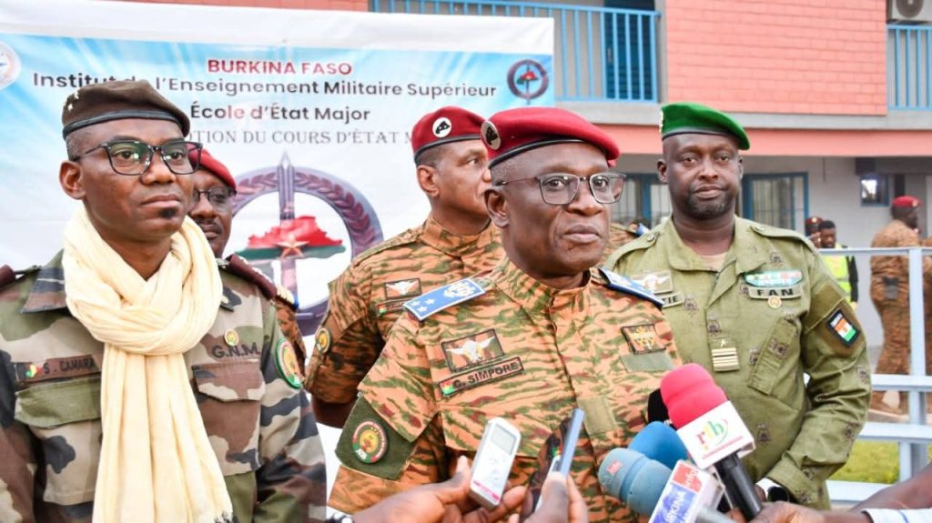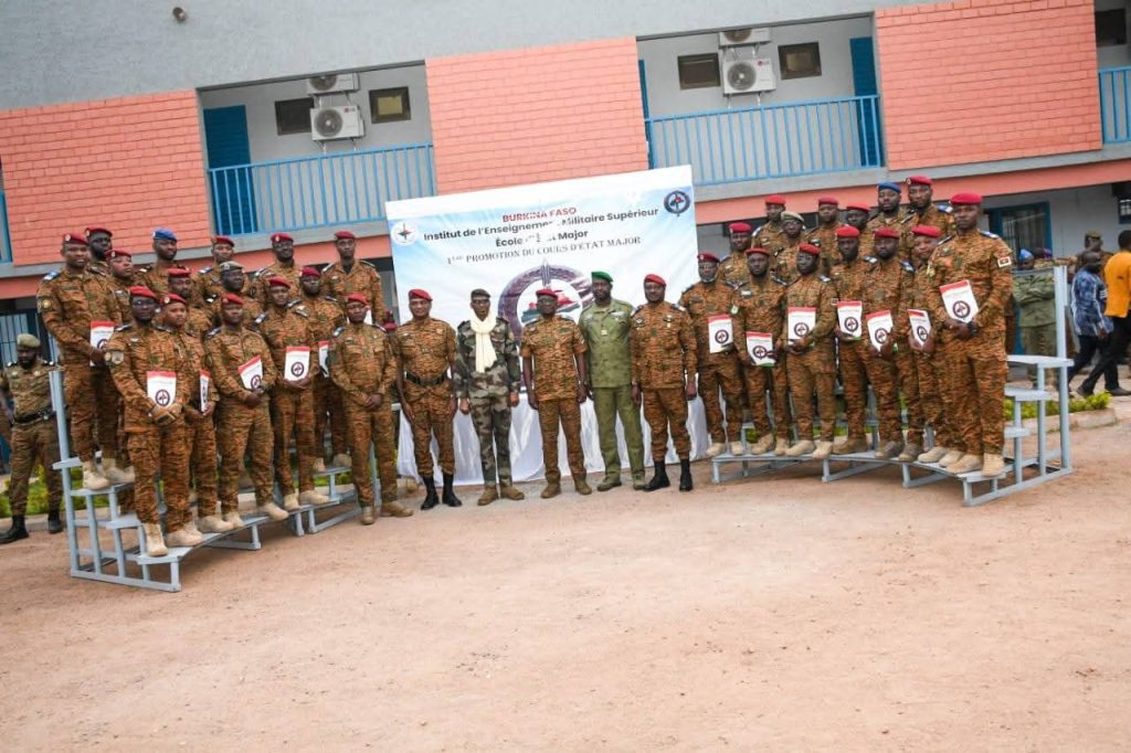 Ce vendredi 27 février 2026, s’est tenue la cérémonie de remise des diplômes aux stagiaires de la première promotion du Cours d’État-Major de l’Institut de l’Enseignement militaire supérieur Tiefo Amoro (IEMS-TA), sous la présidence de Monsieur le Ministre d’ Etat, Ministre de la Guerre et de la Défense Patriotique, le Général de Division Célestin SIMPORE en présence de son homologue de la République sœur du Mali, le Ministre d’État, Ministre de la Défense et des Anciens Combattants, le Général de Corps d’Armée Sadio CAMARA.Durant cinq mois, les stagiaires ont bénéficié d’un enseignement intensif, axé sur la planification et la conduite des opérations militaires. Cette formation marque une étape majeure dans le développement des capacités stratégiques des Forces armées nationales.Au regard des résultats atteints par la formation, Monsieur le Ministre d’ Etat, Ministre de la Guerre et de la Défense Patriotique, s’est réjouis de la création de l’IEMS-TA et attend de ces officiers qu’ils “poursuivent leur perfectionnement sur le terrain dans les états major tactiques dans lesquels ils seront déployés”. En plus de leur parchemins, les nouveaux chefs de guerre les plus remarquables ont été gratifiés de présents.