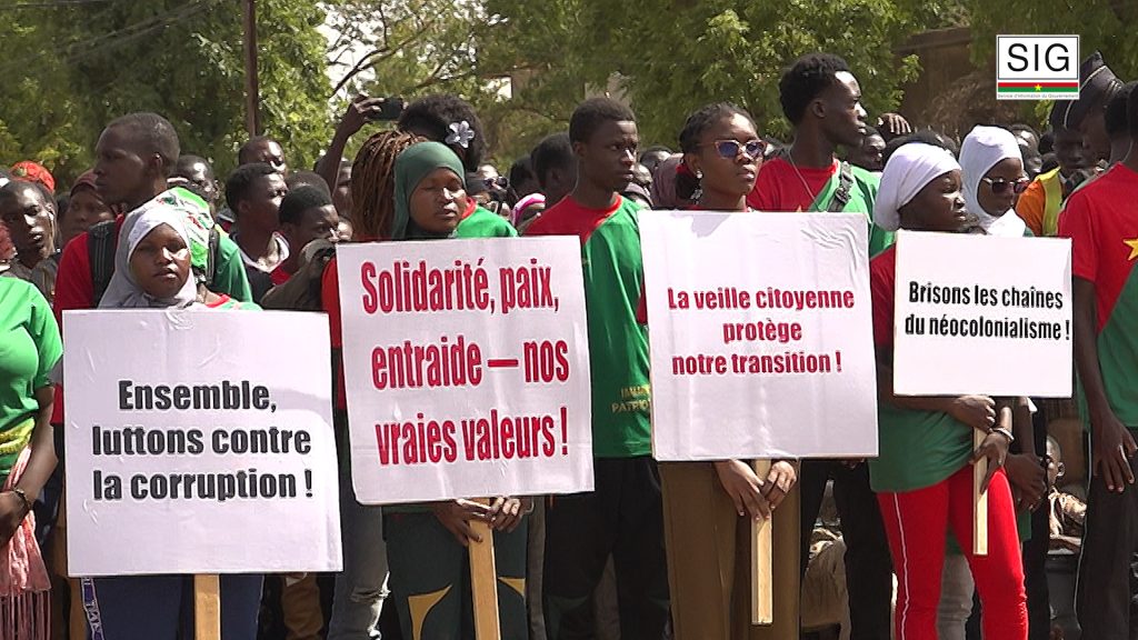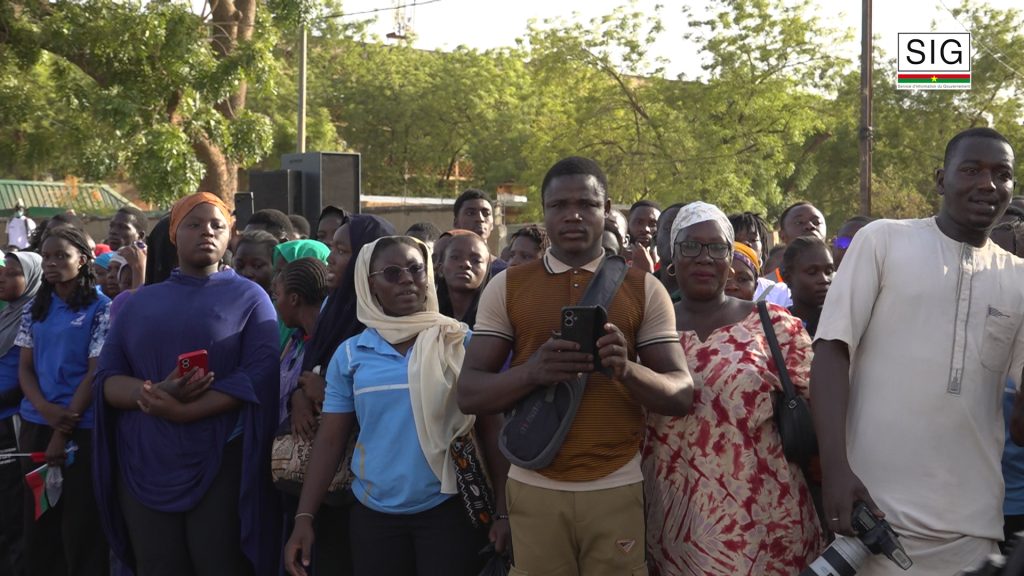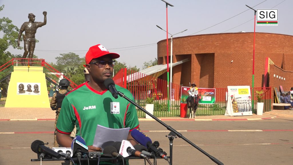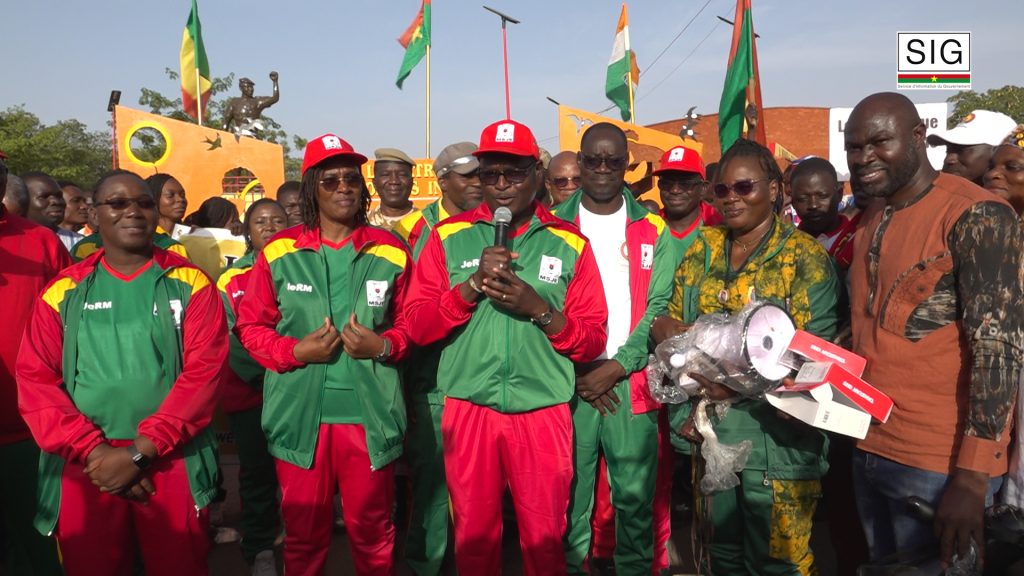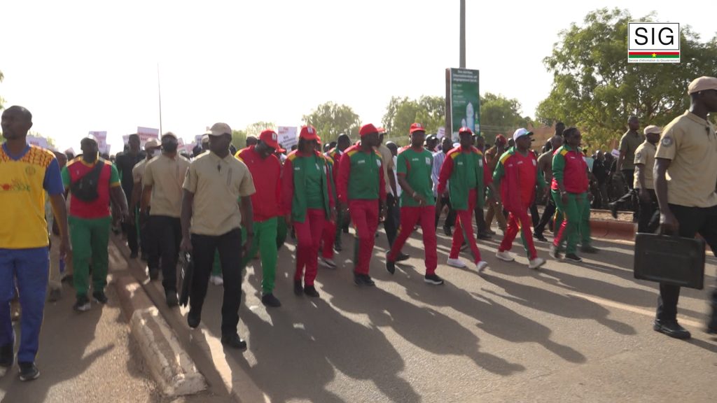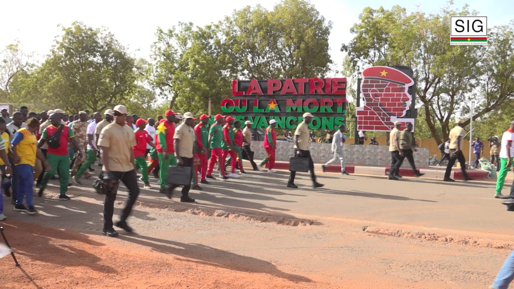 A l’occasion du 6e cérémonial d’hommage militaire au Capitaine Thomas SANKARA père de la révolution burkinabè et à 12 de ses compagnons d’infortune, le Premier ministre Rimtalba Jean Emmanuel OUEDRAOGO a pris la tête d’une marche populaire de soutien à la Révolution progressiste populaire (RPP) et lancé l’initiative « Jeunesse révolutionnaire en marche ». La marche longue de 5 km s’est achevée par un meeting sur le site du Mémorial Thomas SANKARA en présence de milliers de jeunes, de plusieurs membres du Gouvernement dont le Pr Adjima THIOMBIANO ministre chargé l’Enseignement supérieur et celui des Sports et de la jeunesse Madame Annick Lydie Djouma Pikbougoum ZINGUE / OUATTARA. La célébration du premier anniversaire de la proclamation de la Révolution progressiste populaire (RPP) a été l’occasion pour la jeunesse burkinabè de se mobiliser massivement pour rendre un vibrant hommage à Thomas SANKARA et à 12 de ses compagnons et affirmer son attachement aux idéaux révolutionnaires. Des idéaux célébrés lors du 6e cérémonial d’hommage militaire au père de la Révolution burkinabè et à ses compagnons. Comme à l’accoutumée, le cérémonial s’est déroulé en deux actes majeurs : la relève de la garde du Mémorial et la sortie des chevaux.Face à une assistance composée en grande majorité d’élèves et d’étudiants issus des différentes régions et écoles de formation du Burkina, le Premier ministre Rimtalba Jean Emmanuel OUEDRAOGO a lancé l’initiative « Jeunesse révolutionnaire en marche ». Cette initiative est la preuve de l’importance de la place de la jeunesse dans la marche de la RPP. « Vous êtes un pilier fondamental de toute dynamique de progrès au Burkina Faso et de l’ancrage populaire de la Révolution », a-t-il déclaré. L’initiative « Jeunesse révolutionnaire en marche » vise à mobiliser la jeunesse burkinabè autour des valeurs de la Révolution et à promouvoir l’engagement citoyen. Le Chef du Gouvernement a en outre invité les jeunes à s’inscrire dans l’histoire nouvelle de leur pays qui est en train de s’écrire. Afin de soutenir l’initiative « Jeunesse révolutionnaire en marche », le ministre de l’Enseignement supérieur, de la recherche et de l’innovation Pr Adjima THIOMBIANO a annoncé la contribution du personnel de son département qui s’élève à 4 millions de F CFA. Il a par ailleurs appelé toute la jeunesse en général et en particulier les élèves et étudiants à s’abreuver à la source de la révolution et à ses idéaux.
