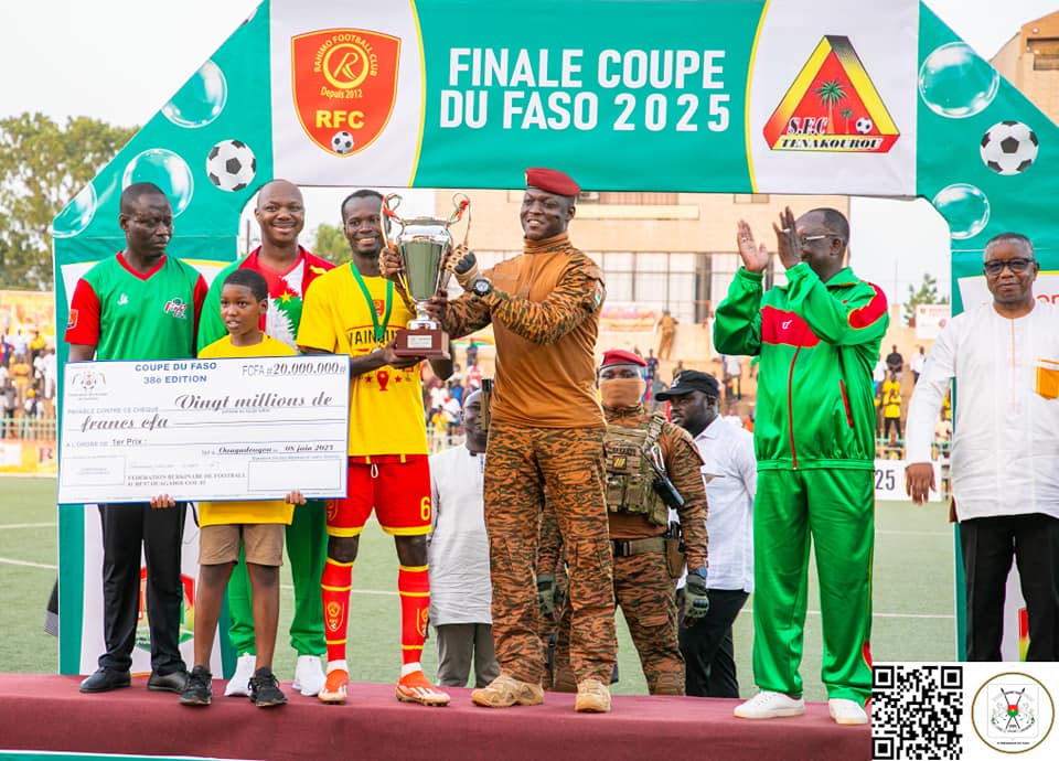 (Ouagadougou, 8 juin 2025). Le Président du Faso, Chef de l’État, le Capitaine Ibrahim TRAORÉ, a remis ce dimanche en début de soirée, le trophée de la 38e édition de la Coupe du Faso à Rahimo Football Club (Rahimo FC) qui a remporté la finale aux tirs au but face au Sporting Football Club des Cascades.