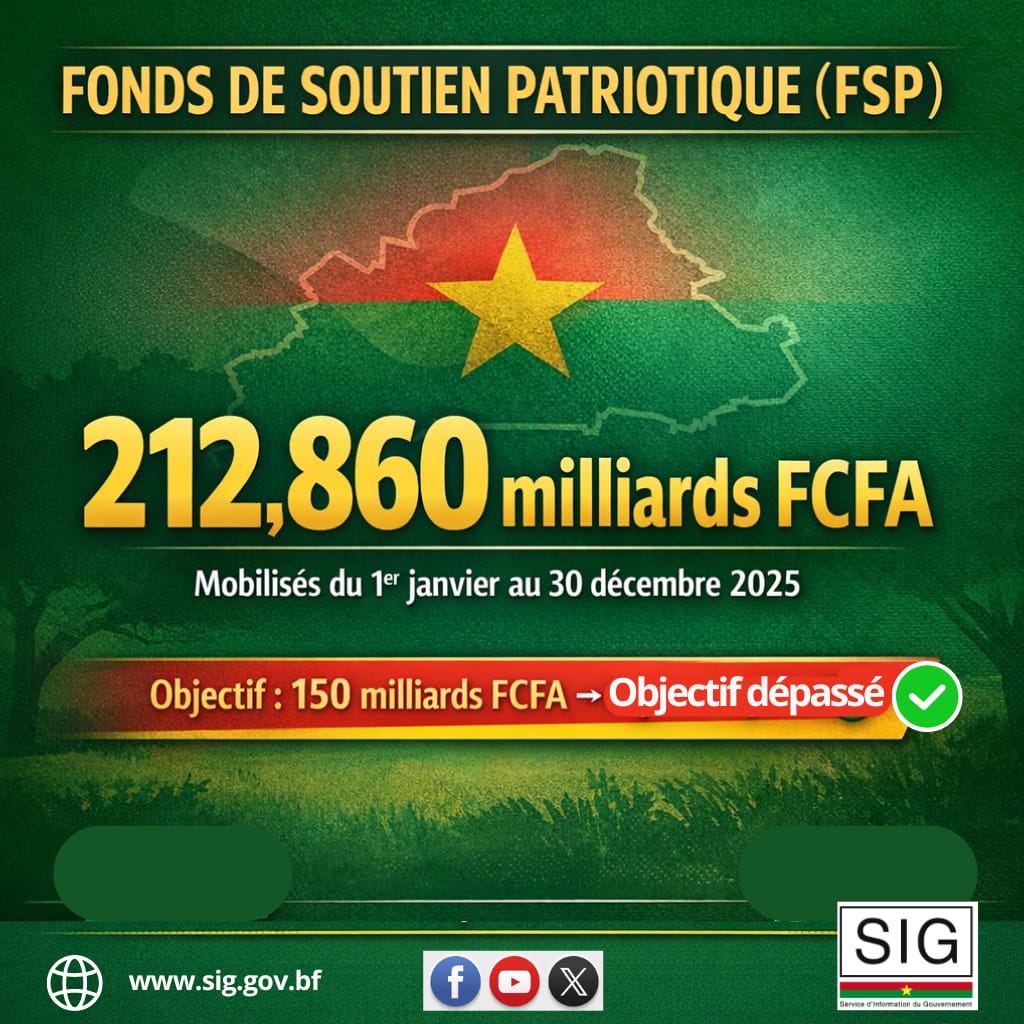 Accueil / Actualités / A La Une / Fonds de Soutien Patriotique FSP : 𝟮𝟭𝟮,𝟴𝟲𝟬 𝗺𝗶𝗹𝗹𝗶𝗮𝗿𝗱𝘀 FCFA mobilisés du 1er janvier au 30 décembre 2025 sur un objectif de 150 milliards.