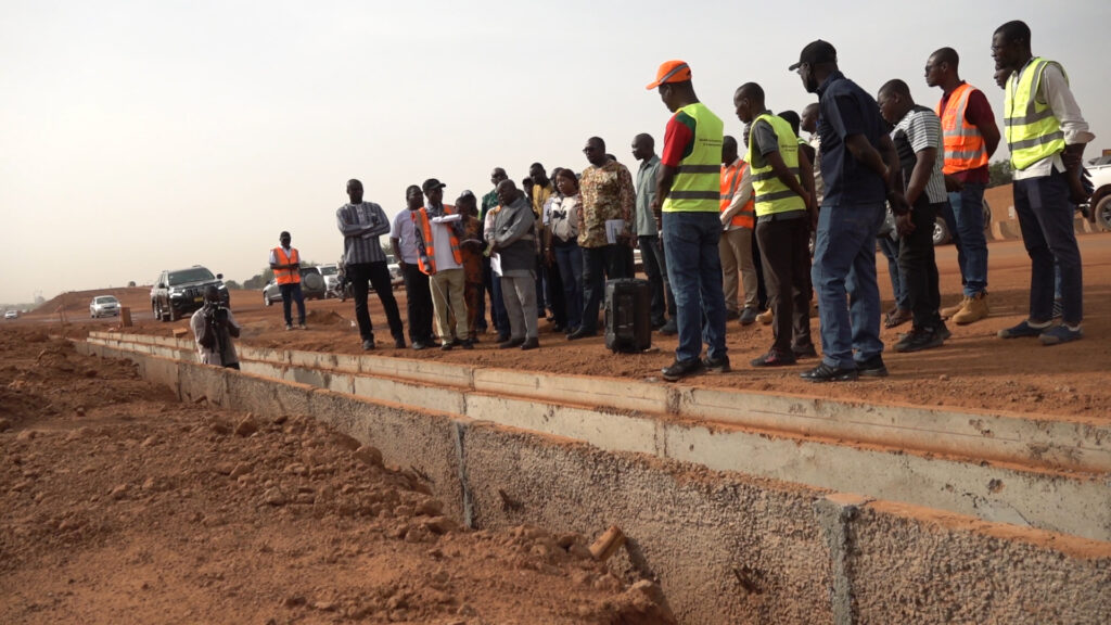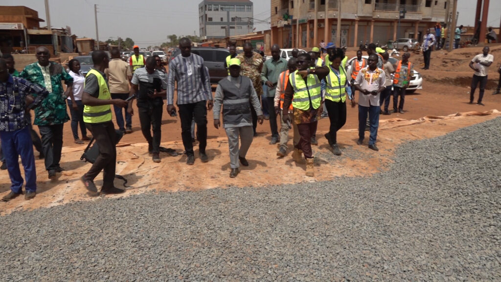 Bien avant l’étape de Bassinko, le ministre en charge des infrastructures et sa suite se sont rendus au quartier Kossodo, secteur n°41 de la ville de Ouagadougou, où ils ont visité la rocade du Nord, un projet de construction et de bitumage qui fait la jonction entre le boulevard des Tansoba, la route nationale numéro 03 (RN03) et l’échangeur du Nord. Les travaux sur ce tronçon, long de 10 kilomètres 200, sont presque terminés et le taux d’exécution est estimé à 73 %, a pu vérifier le ministre SORGHO. Il a toutefois montré sa désapprobation face à la réalisation de caniveaux extérieurs longs de 2 kilomètres 600, que l’entreprise a initiés sans son avis. Il a par ailleurs invité l’entreprise à se focaliser exclusivement sur le marché de base.