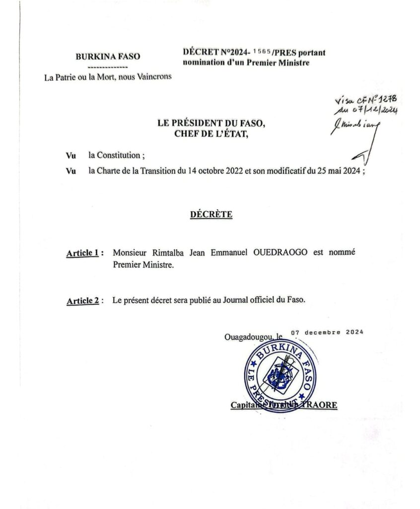 Accueil / Actualités / Monsieur Rimtalba Jean Emmanuel OUEDRAOGO est nommé Premier ministre du Burkina Faso.
