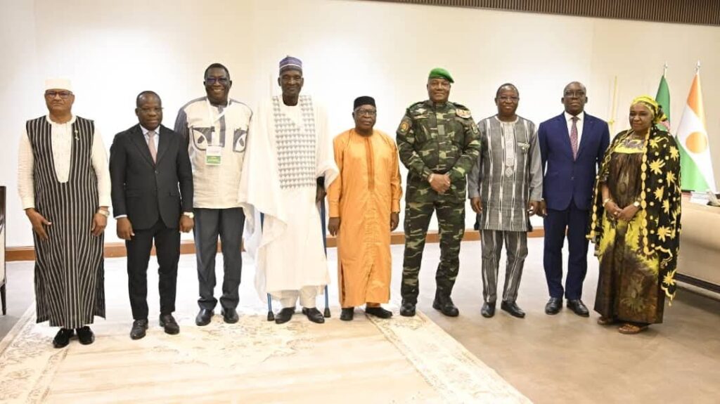 En marge de la première édition du Forum national de la Recherche Scientifique et de l’Innovation (FNRSIT), tenue du 22 au 24 septembre 2025 , le Pr Adjima THIOMBIANO, Ministre de l’Enseignement Supérieur, de la Recherche et de l’Innovation du Burkina Faso, le Pr Boureima Kansaye, Ministre de l’Enseignement Supérieur et de la Recherche Scientifique du Mali, M.Natchaba Kanka-Malik, Ministre de l’Enseignement Supérieur et de la Recherche du Togo et le Pr.Mamadou Saidou, Ministre nigérien de l’Enseignement Supérieur, de la Recherche et de l’Innovation Technologique ont été reçus au Palais Présidentiel par le Président de la République du Niger, Son Excellence le Général d’armée ABDOURAHMANE TIANI.