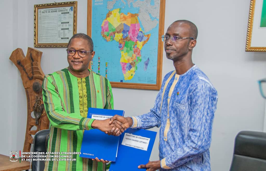 Pour le Chef de la diplomatie burkinabè, cette signature constitue un pas logique après la création de la radio il y a quelques semaines. Il a, à cet effet, félicité le ministre de la Communication, Monsieur Pingdwendé Gilbert Ouédraogo, pour son engagement sans faille à accompagner l’initiative.