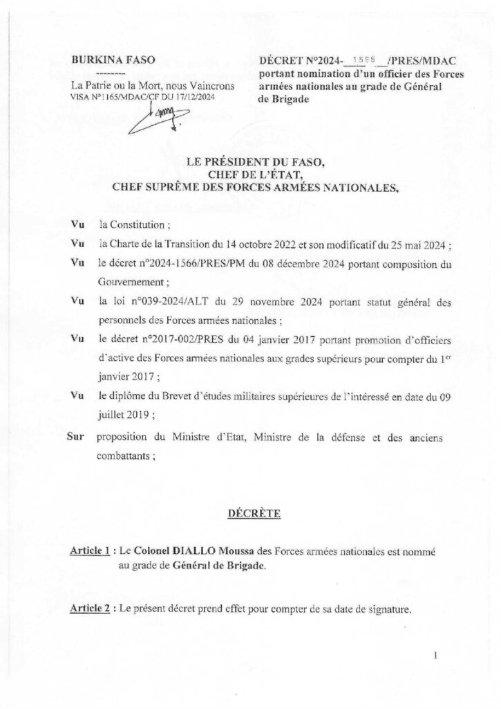Accueil / Communiqués / Le Colonel DIALLO Moussa est nommé au grade de Général de Brigade.